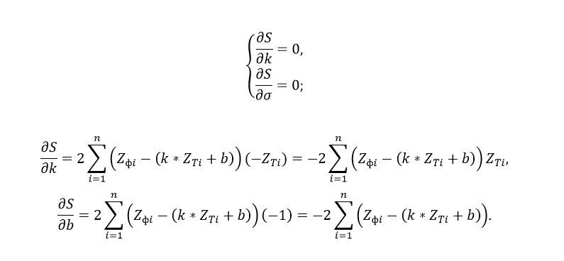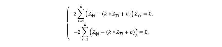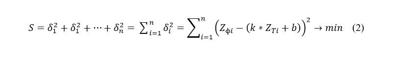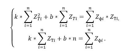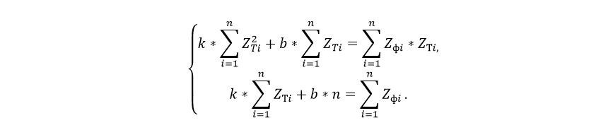 Так как точки (ZT1; Zф1), (ZT2; Zф2), … (ZTn; Zфn) не обязательно лежат на одной прямой, то, подставляя вместо ZT и Zф значения координат этих точек в выражение Zф — (k*ZT +b), получаем равенства: