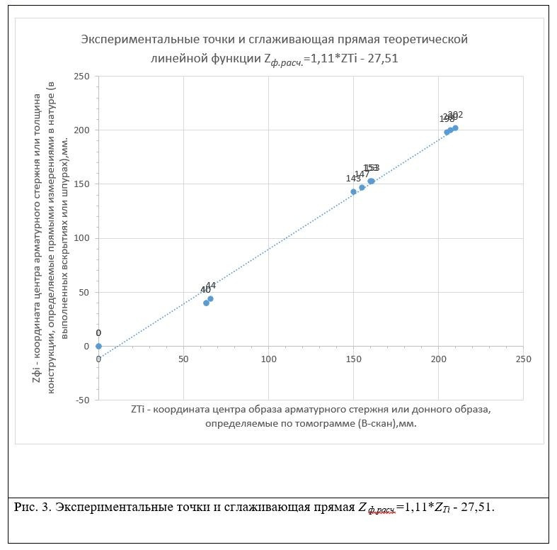 Для повышения точности определения толщины защитного слоя бетона стальной арматуры ультразвуковым эхометодом, предлагается выполнить установление градуировочной зависимости, между величиной ZT — координатой центра образа арматурного стержня или донного образа, определяемой по томограммам (B-сканам) и величиной Zф — координатой центра арматурного стержня или толщиной конструкции, определяемой прямыми измерениями в натуре.