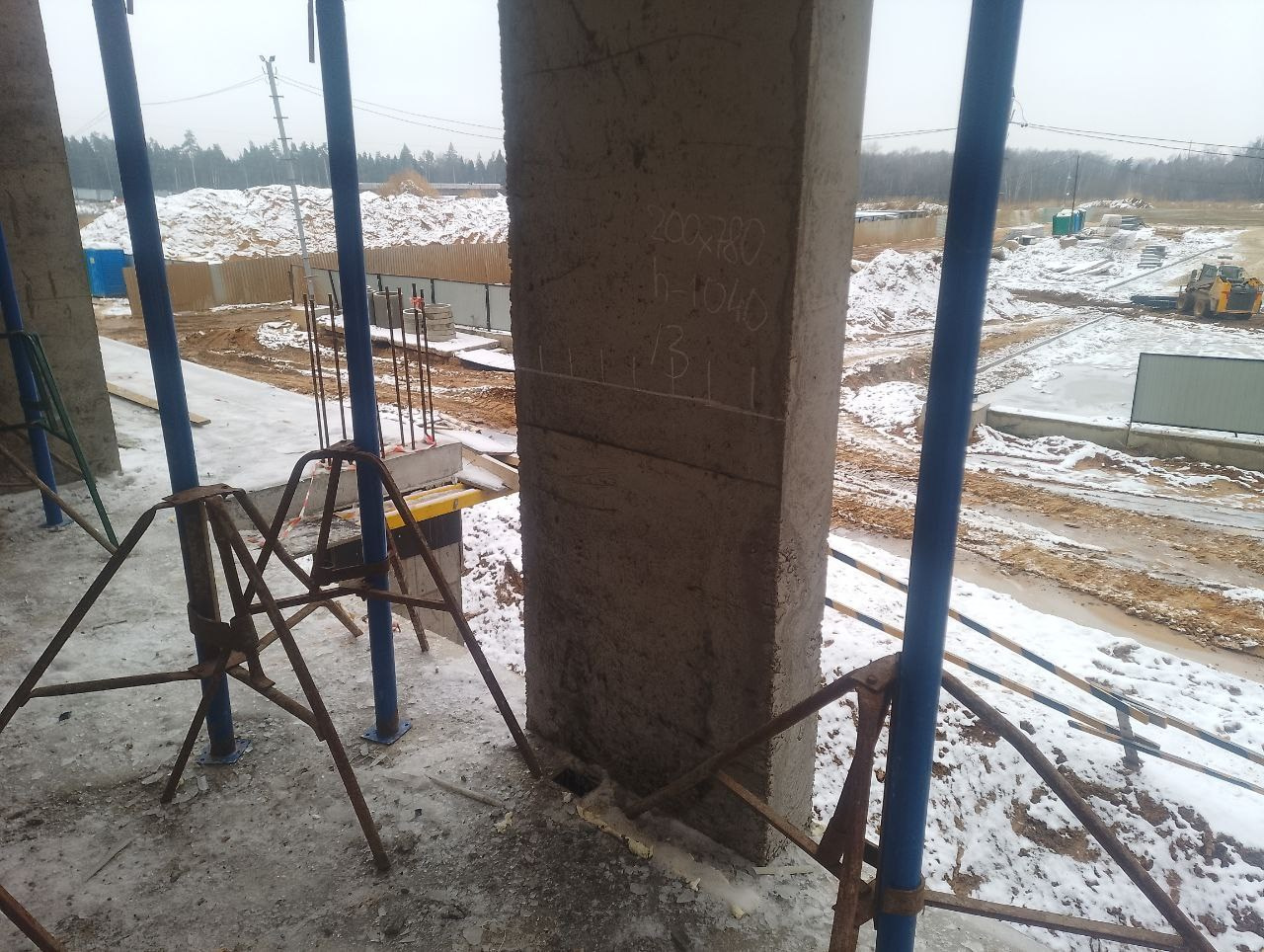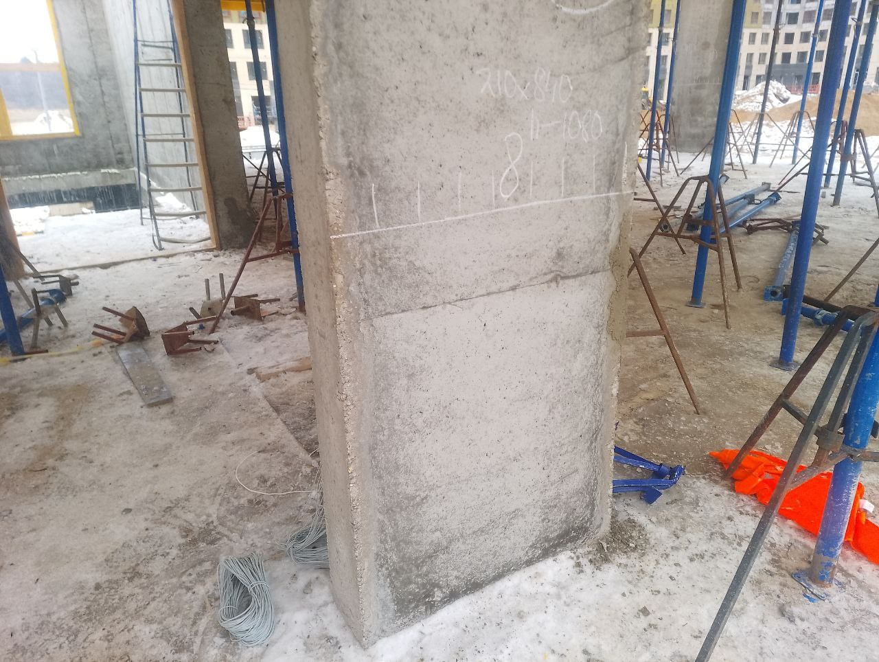 Бетонирование вертикальных несущих монолитных железобетонных конструкций (пилонов и стен) выполнялось без приемки армирования с оформлением АОСР. Общий вид обследуемых конструкций представлен на рисунках ниже:
