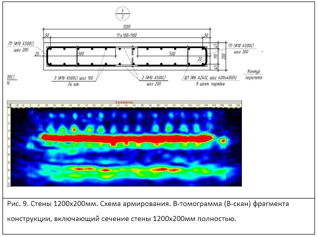 В данном случае, применение ультразвукового эхометода, позволяет получить горизонтальные сечения фрагмента конструкции (при единичном измерении) или сечение пилона или стены целиком, что делает удобным и наглядным определение такого параметра, как проектное количество стержней в сечении и характер их расположения.